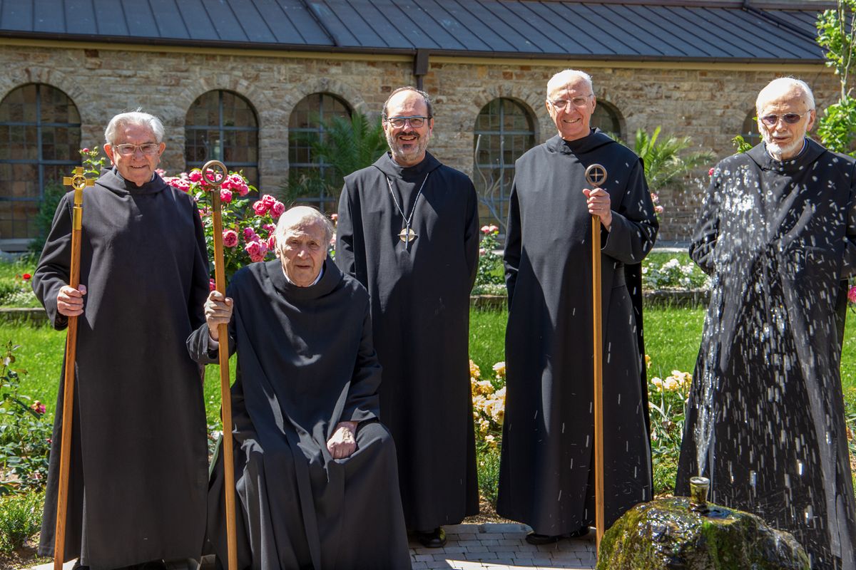 Münsterschwarzach (POW) Mit den Ehrungen der Jubilare ist am Sonntag, 21. Juni, in der Benediktinerabtei Münsterschwarzach im Mönchskonvent sowie mit Verwandten und Freunden das Herz-Jesu-Fest gefeiert worden, teilt die Abtei mit. Abt Michael Reepen dankte seinen Mitbrüdern für ihre Treue und ihren Einsatz für die Gemeinschaft von Münsterschwarzach. Vor dem Abt und der versammelten Klostergemeinschaft erneuerten die Jubilare ihre Gelübde, die sie an gleicher Stelle vor 60 und 25 Jahren in der Abteikirche gesprochen hatten, und gelobten, sich weiterhin für die Aufgaben der Abtei Münsterschwarzach einzusetzen und mit den Mitbrüdern den klösterlichen Weg zu gehen.